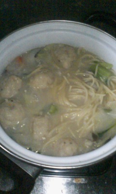 冷蔵庫にあった野菜、ベーコン、鳥団子、キノコなどを入れてグツグツ